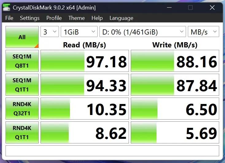 Son olarak, dahili depolamayı test etmek istedim. Patriot, burada kullandıkları depolama türünün spesifikasyonlarını listelemiyor, ancak sorduktan sonra gömülü bir depolama olduğunu belirttiler, bu nedenle taşınabilir bir SSD'den bekleyeceğiniz çarpıcı hızları beklemeyin. Aşağıda, MD330 için basit bir CrystalDiskMark testi bulunmaktadır.