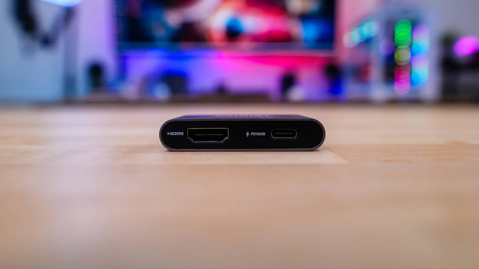 Diğer tarafta ise iki bağlantı var; bir HDMI ve bir dişi USB-C. HDMI, tam boyutlu bir port olup 4K 60Hz çıkış kapasitesine sahiptir. USB-C portu, cihazınızla birlikte gelen güç adaptöründen 100W'a kadar güç alabilir. Bunun harika yanı, genellikle bir dongle veya adaptör taktığınızda o şarj portunu kaybetmenizdir (özellikle telefonlarda), bu da bu sorunu çözüyor. Cihazınız, depolama veya HDMI portunu kullanırken hala şarj edilebilir!